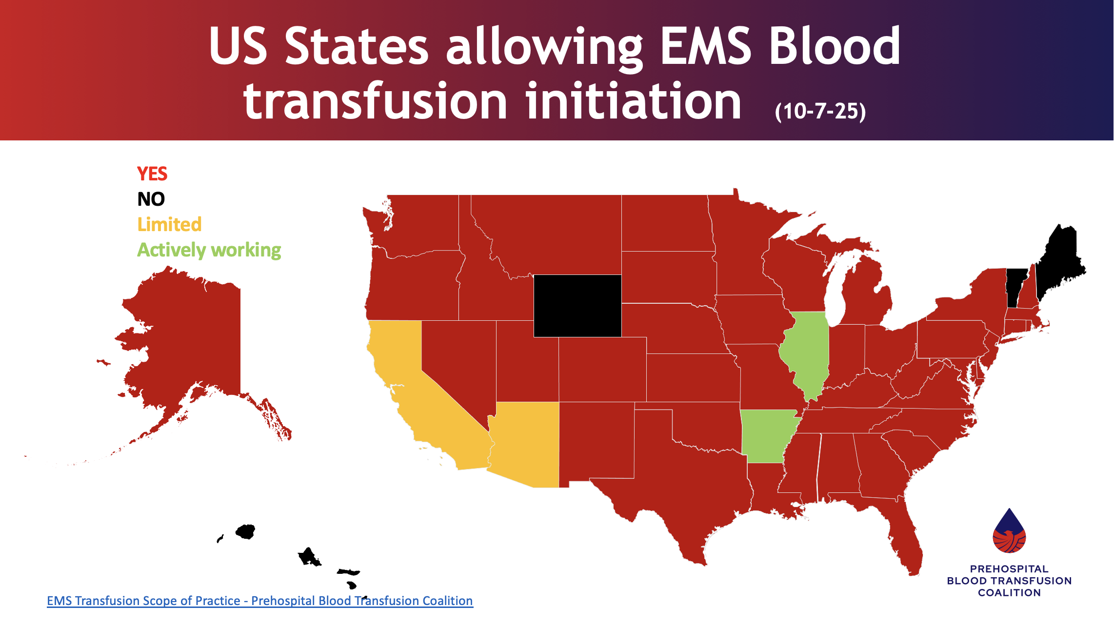 Scope of Practice for EMS clinicians is determined at the state level. While there is a National Scope of Practice Model at the national level, each state’s Office of EMS is ultimately responsible for the clinician’s scope of practice in their state. As of the date indicated on the map, this is the status of those states which allow EMS clinicians (at the paramedic level) to initiate blood transfusions in the field. We will update this map as additional states modify their state scope of practice.
